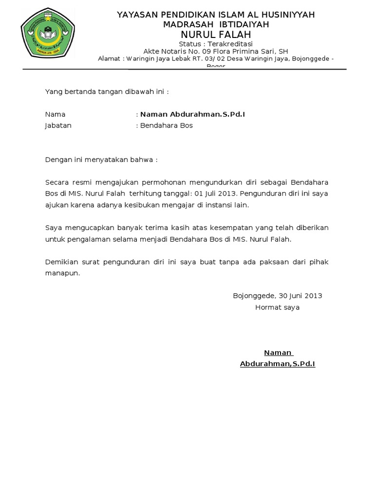 Contoh Surat Pengunduran Diri Dari Jabatan Bendahara